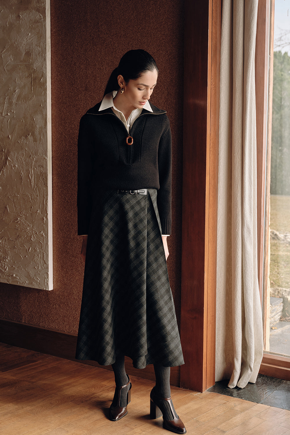 Romantik fular detaylı bluzlar, maskülen ceketlerle dengelenirken; uçuşan etekler ve desenli elbiseler koleksiyona zarif bir dinamizm katıyor. Ekose desenli modeller kış modasının klasik ruhunu modern bir dille yeniden yorumluyor. İskoç tarzı pileli etekler, deri toka aksesuarlarla birleşerek sezonun en güçlü parçalarından biri oluyor. Exquise imzası haline gelen gömlekler ve gömlek elbiseler ise sezonda fonksiyonel şıklığı temsil ediyor. Hafif parıltı veren taş detaylı ceketler ise gündüzden geceye şıklığı kesintisiz devam ettiriyor.