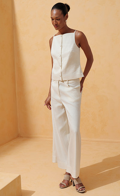 Yüksek Bel Fermuarlı Cepli Geniş Paça Regular Krem Pantolon