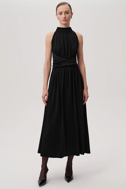 Uzun Kollu Kuşaklı Düşük Bel Regular Siyah Midi Elbise