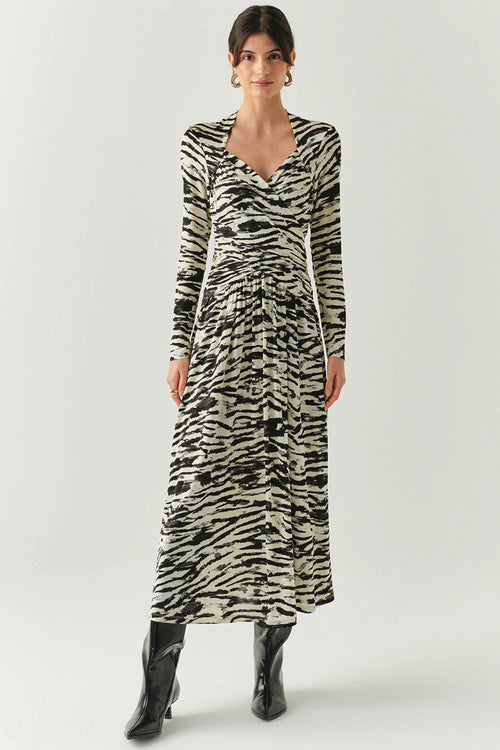 Zebra Desenli Beli Ribanalı Regular Astarlı Midi Siyah Kemik Elbise