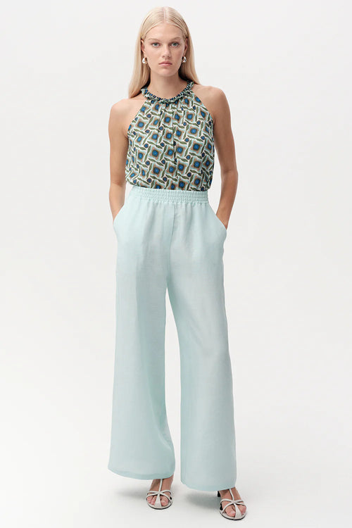 Beli Lastikli Cepli Keten Karışımlı Regular Turkuaz Pantolon