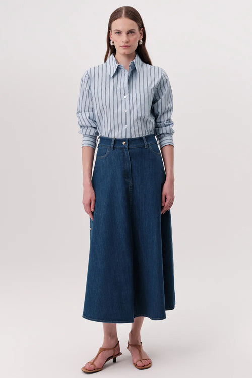 Yüksek Bel Çıt Çıt Detaylı Cepli Fermuarlı Regular Denim İndigo Etek