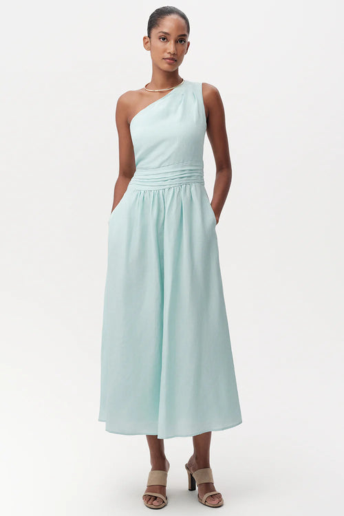Bele Oturan Keten Karışımlı Regular Midi Turkuaz Elbise