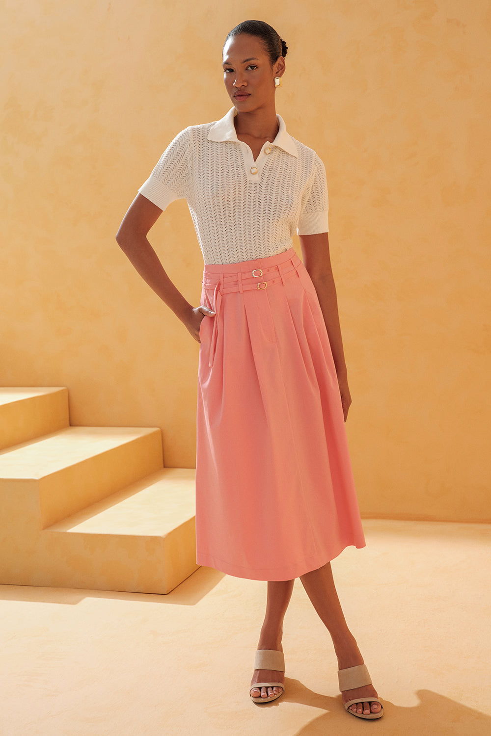 Beli Kemerli Yüksek Bel Pileli Cepli Midi Pembe Etek