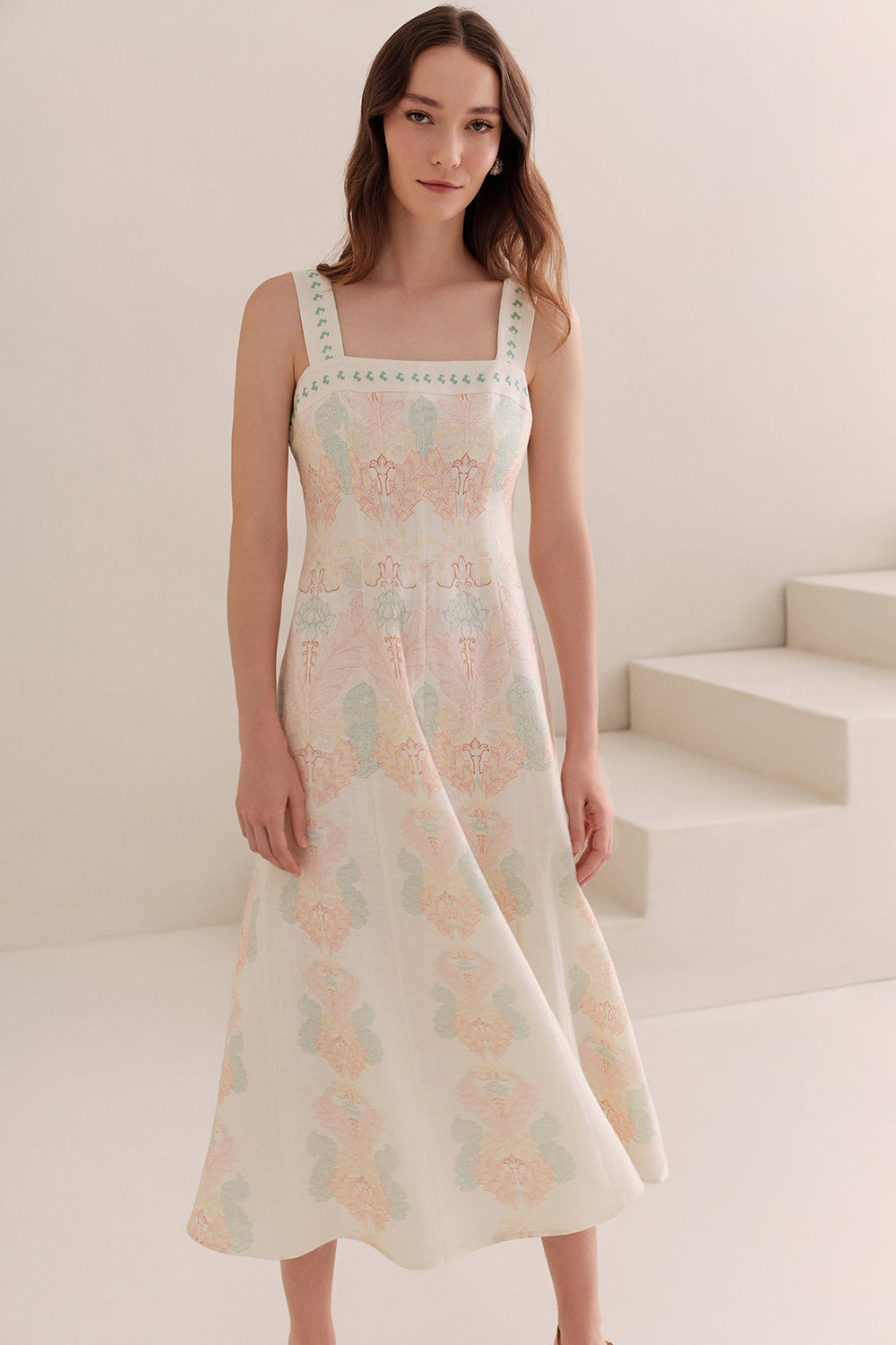 Bele Oturan Fermuarlı Keten Regular Midi Çok Renkli Elbise