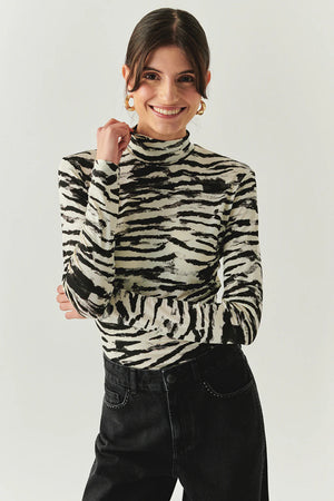 Leopar Desenli Boğazlı Slim Fit Uzun Kollu Örme Bluz