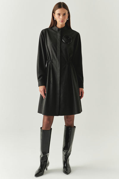 Modern ve sofistike çizgileriyle öne çıkan bu mini elbise, hakim yaka detayı ve minimal tasarımıyla zamansız bir şıklık sunar. Göğüs kısmındaki çiçek aksesuarı feminen bir dokunuş katarken, beli lastikli yapısı vücuda uyum sağlayarak konforlu bir kullanım imkânı tanır. Regular kesimi sayesinde hem ofis şıklığında hem de akşam davetlerinde rahatlıkla tercih edilebilir. Diz boyu çizmeler ve zarif bir clutch çanta ile tamamlandığında etkileyici bir kış kombini oluşturur.
