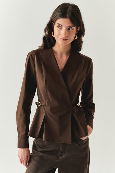 Bu uzun kollu slim fit gömlek, kruvaze yaka formu ve bel kısmındaki tokalı detaylarıyla modern bir siluet sunar. Kumaşın pürüzsüz dokusu konfor sağlarken, bel hatlarını belirginleştiren tasarım özel günlerden iş kombinlerine kadar çok yönlü bir kullanım imkânı verir. Zarif kesimi ve sofistike duruşu ile stilinizi güçlü bir şekilde tamamlar.