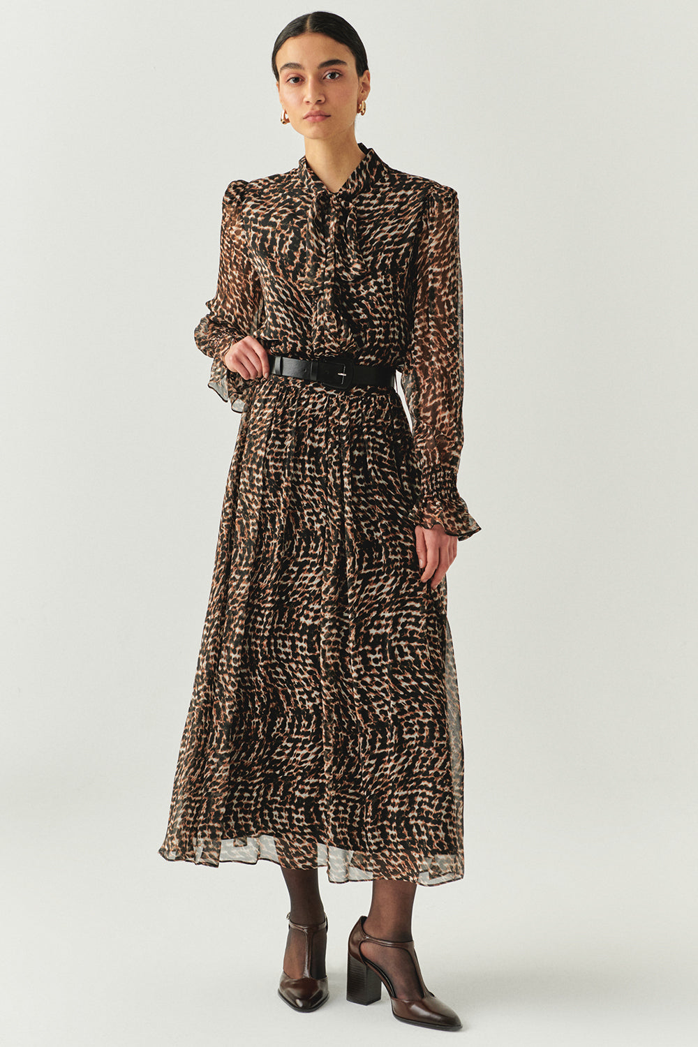 Leopar desenin enerjisini ve dinamizmini yansıtan bu midi elbise, astarlı yapısı ve şık kemer detayıyla modern bir siluet oluşturur. Regular fit kesimi sayesinde konforlu bir kullanım sunarken, uzun kolları ve midi boyu ile mevsim geçişlerinde ideal bir tercihtir. Günlük şehir stilinde topuklu çizmelerle, özel davetlerde ise zarif stiletto ve minimal aksesuarlarla kolayca kombinlenebilir.