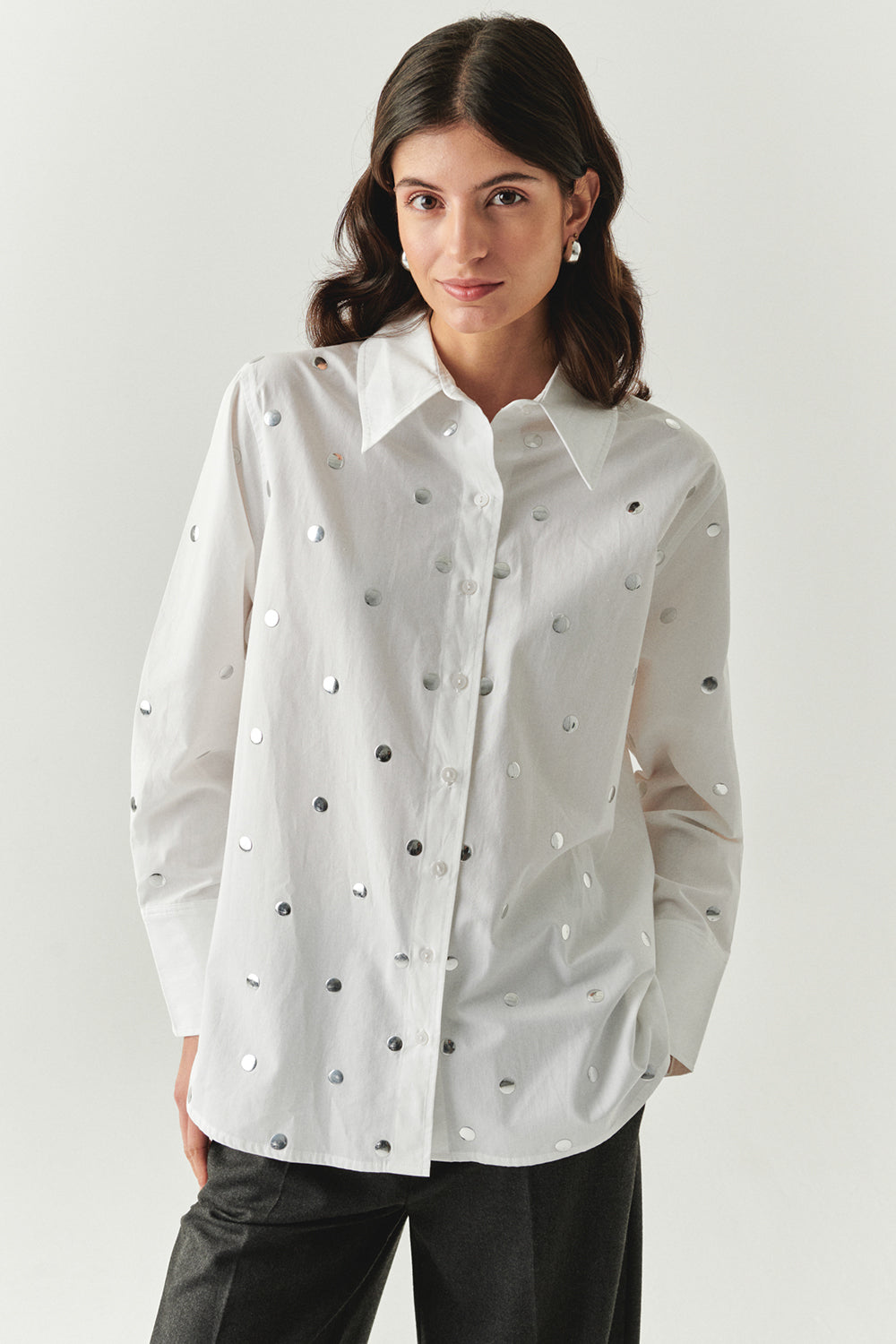 Modern ve ışıltılı bir stil sunan bu oversize gömlek, tüm yüzeye serpiştirilmiş metal taş işlemeleriyle dikkat çeker. Rahat kesimi ve uzun kollu tasarımı, konforla birlikte şıklığı bir araya getirir. Hem günlük stillerde hem de özel davetlerde iddialı bir görünüm için ideal bir seçimdir. Jean pantolonlardan kumaş eteklere kadar farklı parçalarla kolayca kombinlenerek gardırobunuzun göz alıcı parçalarından biri olur.
