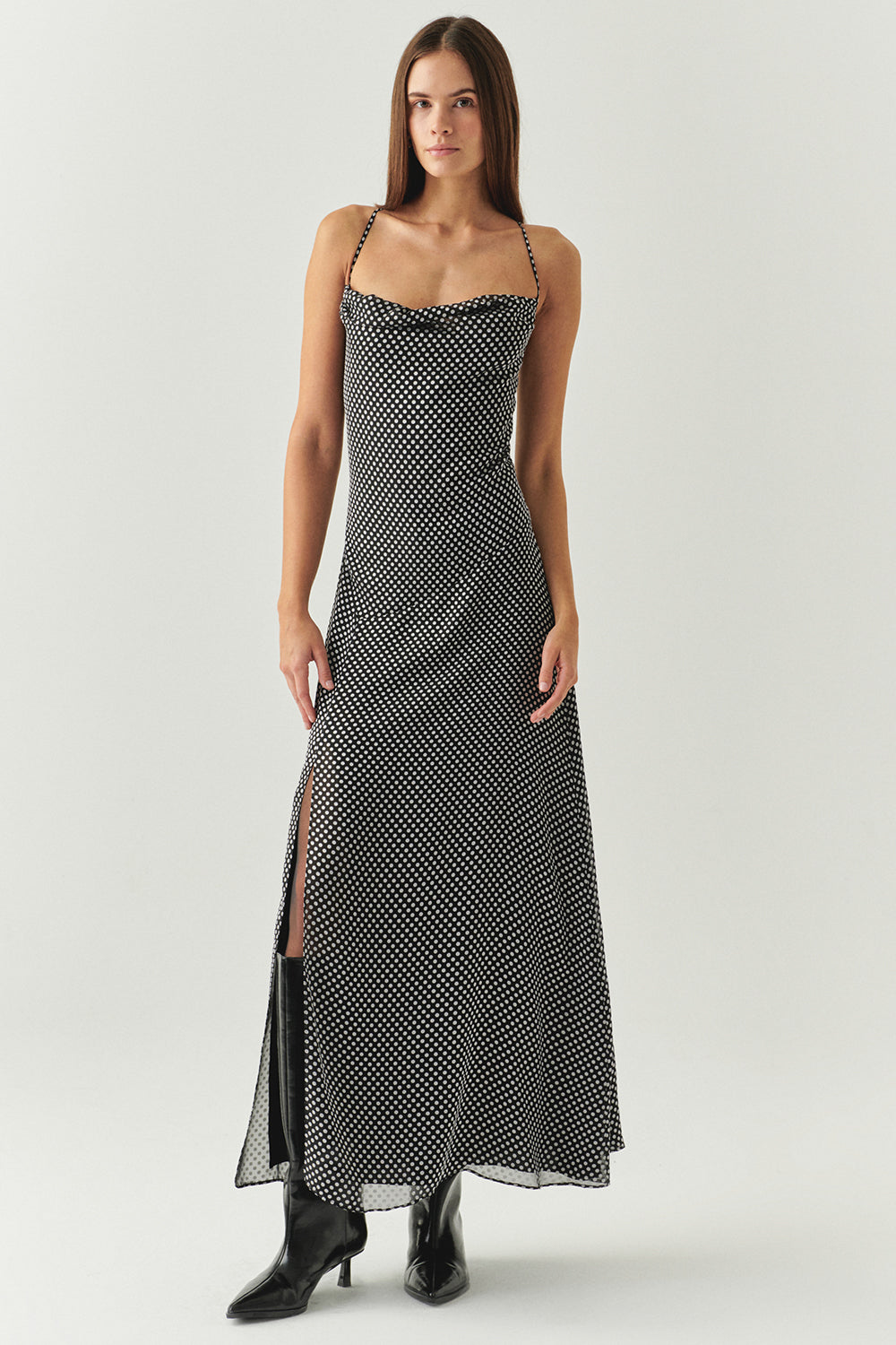 Puantiyeli Degaje Yaka Yırtmaçlı Regular Midi Gri Siyah Elbise