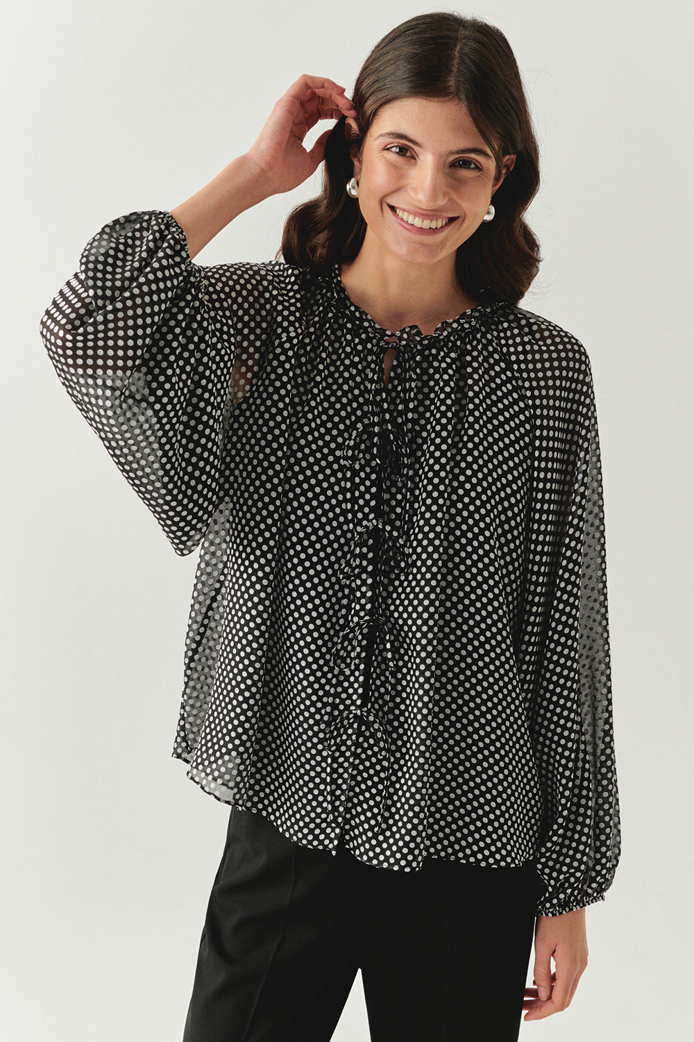 Puantiyeli Uzun Kollu Bağcıklı Regular Gömlekmodeli, zarif ve zamansız tasarımıyla sezonun en sofistike parçalarından biri. Şeffaf dokulu hafif kumaşı, feminen bir duruş sunarken volanlı ön kısmındaki bağcık detayı romantik bir hava katıyor. Rahat kesimiyle gün boyu konfor sağlarken, klasik puantiye deseni ile her stile kolayca uyum sağlıyor. Ofis şıklığından özel davetlere kadar her ortamda fark yaratacak bir parça.