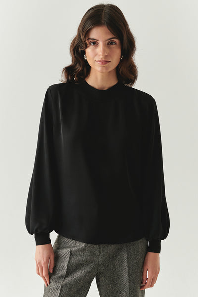 Akıcı dokusu, yuvarlak yaka formu ve bilekte toparlanan uzun kollarıyla zamansız bir şıklık sunan bu siyah bluz, rahat kesimi sayesinde gün boyu konfor sağlar; gri pantolonlarla ofis stilinizi, kot ve loafer’larla ise hafta sonu görünümünüzü tamamlayarak her ortamda sade ama güçlü bir etki yaratır.