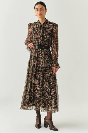 Leopar Desen Uzun Kollu Kemerli Astarlı Regular Midi Elbise