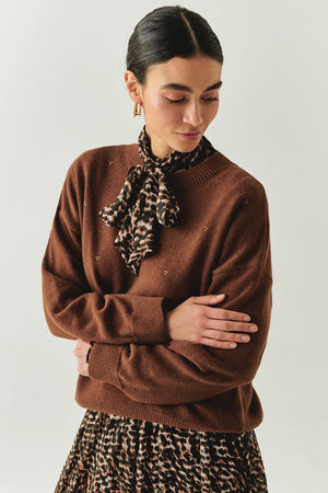 Bisiklet Yaka Uzun Kollu Oversize Taş Baskılı Triko Kahve Bluz
